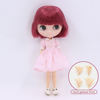 Amelia is dressed in a charming pink dress with puffed sleeves and a collar, adorned with delicate buttons down the front. The dress is made from a soft, textured fabric that adds depth and interest to her overall look. She also wears a pair of white shoes, completing her adorable ensemble. Amelia’s attire is a testament to the meticulous attention to detail that goes into each of our Custom Middie Blythe Dolls.