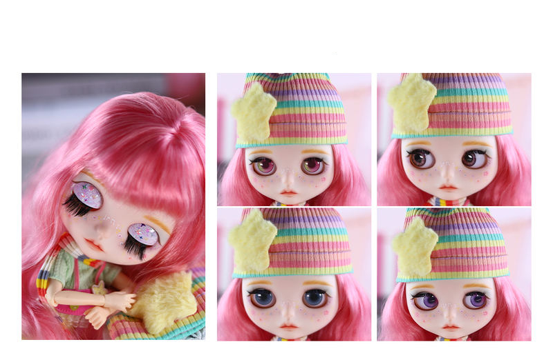 Neo Blythe Doll models come with four different eye colors and positions. Blythe has a large head to incorporate the eye-change mechanism, which is controlled by a pull cord running from the back of the head that all work without the help of batteries. Blythe’s eyes are large and round, and they change from a variety of colors such as green, pink, yellow, blue, brown, and gray each time the string is pulled, momentarily closing between each cord pull. Although each Blythe doll comes with four sets of eyechips already installed, you can always customize Blythe eyechips to your liking from galaxy design to hearts to human-like eyes. In addition to traditional eye dolls, some of the new generation custom Blythe dolls have sleepy eyes integrated, which a second cord allows changing the gaze into the sleepy position.