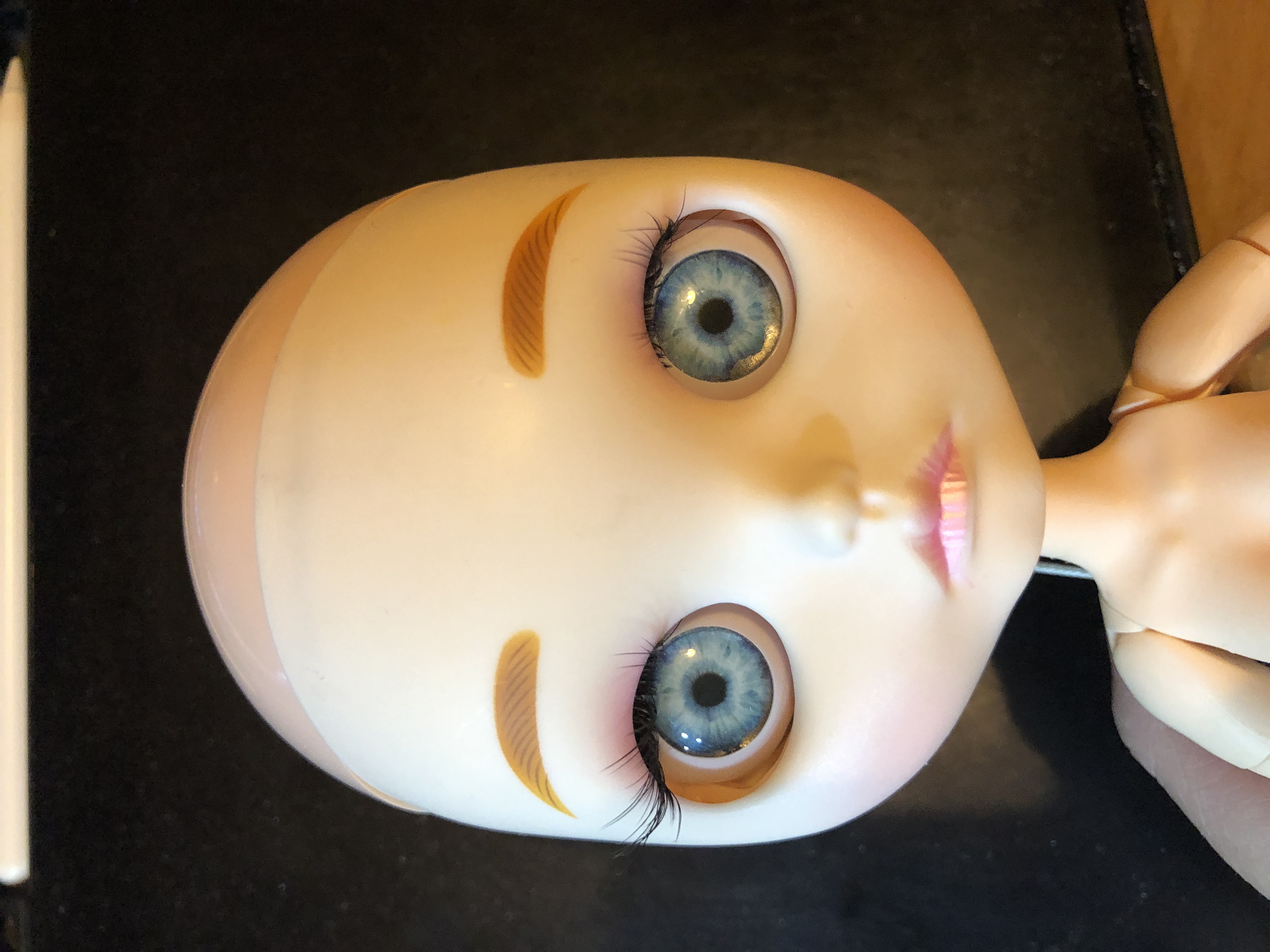 Neo Blythe Doll models come with four different eye colors and positions. Blythe has a large head to incorporate the eye-change mechanism, which is controlled by a pull cord running from the back of the head that all work without the help of batteries. Blythe’s eyes are large and round, and they change from a variety of colors such as green, pink, yellow, blue, brown, and gray each time the string is pulled, momentarily closing between each cord pull. Although each Blythe doll comes with four sets of eyechips already installed, you can always customize Blythe eyechips to your liking from galaxy design to hearts to human-like eyes. In addition to traditional eye dolls, some of the new generation custom Blythe dolls have sleepy eyes integrated, which a second cord allows changing the gaze into the sleepy position.