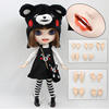 Neo Blythe Doll models come with four different eye colors and positions. Blythe has a large head to incorporate the eye-change mechanism, which is controlled by a pull cord running from the back of the head that all work without the help of batteries. Blythe’s eyes are large and round, and they change from a variety of colors such as green, pink, yellow, blue, brown, and gray each time the string is pulled, momentarily closing between each cord pull. Although each Blythe doll comes with four sets of eyechips already installed, you can always customize Blythe eyechips to your liking from galaxy design to hearts to human-like eyes. In addition to traditional eye dolls, some of the new generation custom Blythe dolls have sleepy eyes integrated, which a second cord allows changing the gaze into the sleepy position.