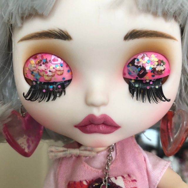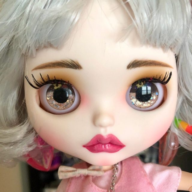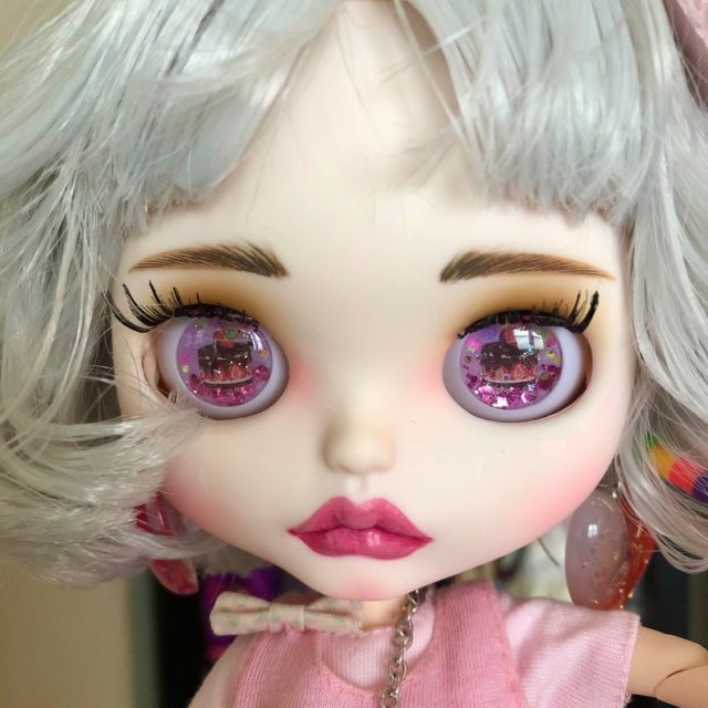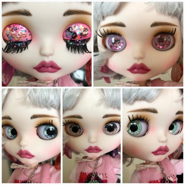 Neo Blythe Doll models come with four different eye colors and positions. Blythe has a large head to incorporate the eye-change mechanism, which is controlled by a pull cord running from the back of the head that all work without the help of batteries. Blythe’s eyes are large and round, and they change from a variety of colors such as green, pink, yellow, blue, brown, and gray each time the string is pulled, momentarily closing between each cord pull. Although each Blythe doll comes with four sets of eyechips already installed, you can always customize Blythe eyechips to your liking from galaxy design to hearts to human-like eyes. In addition to traditional eye dolls, some of the new generation custom Blythe dolls have sleepy eyes integrated, which a second cord allows changing the gaze into the sleepy position.