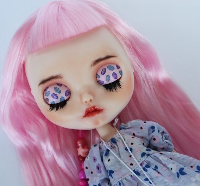 Neo Blythe Doll models come with four different eye colors and positions. Blythe has a large head to incorporate the eye-change mechanism, which is controlled by a pull cord running from the back of the head that all work without the help of batteries. Blythe’s eyes are large and round, and they change from a variety of colors such as green, pink, yellow, blue, brown, and gray each time the string is pulled, momentarily closing between each cord pull. Although each Blythe doll comes with four sets of eyechips already installed, you can always customize Blythe eyechips to your liking from galaxy design to hearts to human-like eyes. In addition to traditional eye dolls, some of the new generation custom Blythe dolls have sleepy eyes integrated, which a second cord allows changing the gaze into the sleepy position.