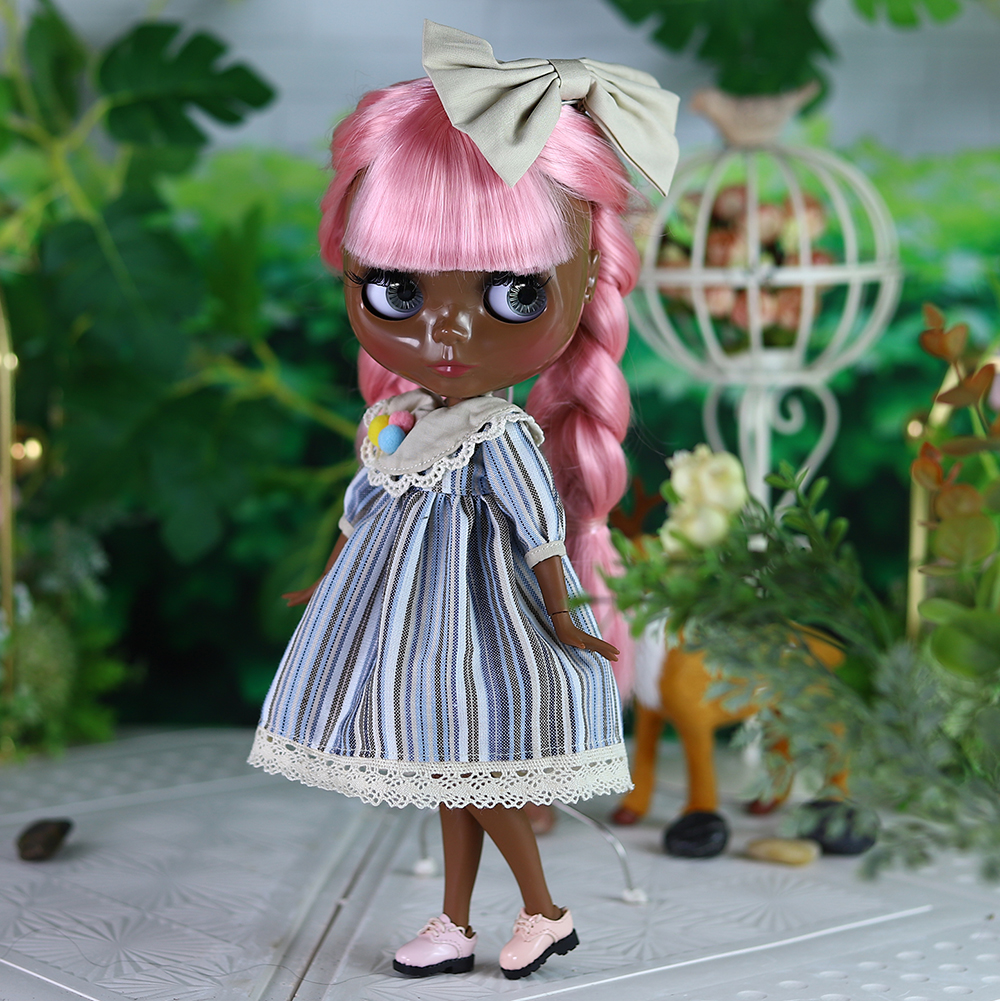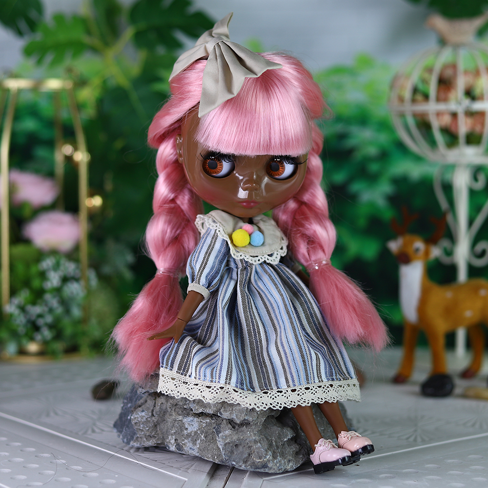 Gracie – Premium Custom Neo Blythe Doll with Pink Hair, Black Skin & Shiny Cute Face
