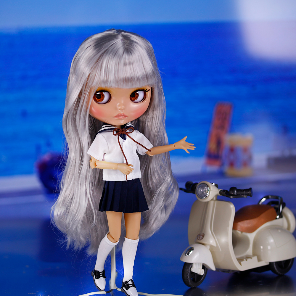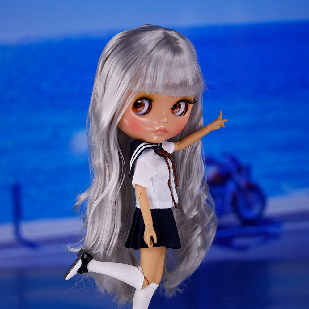 Ivy – Premium Custom Neo Blythe Doll with Silver Hair, Tan Skin & Shiny Cute Face