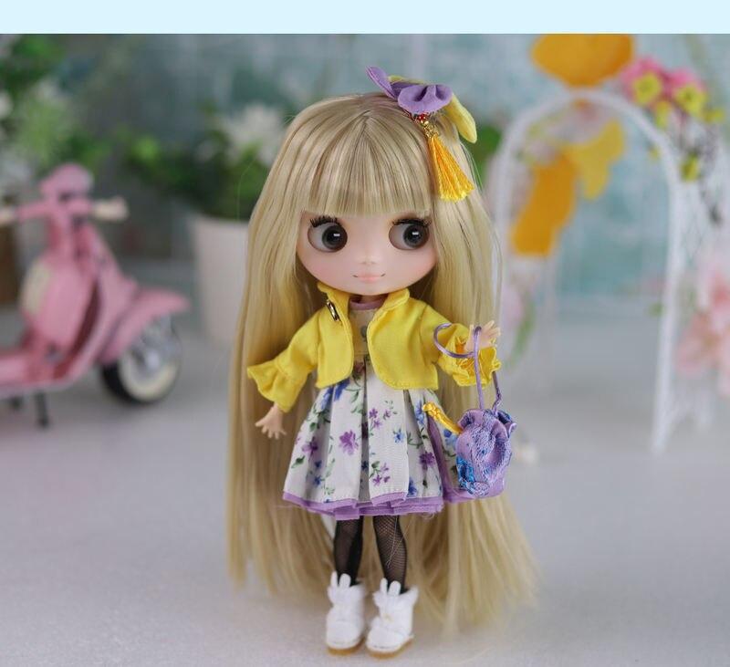 Dressed to impress, Lily wears a charming floral dress featuring delicate purple blossoms on a white background. The dress is accented with a bright yellow jacket, perfectly complementing her colorful hair bows. Her outfit is completed with a pair of stylish white boots, tying the ensemble together seamlessly. Lily’s attire is a testament to the careful attention to detail that goes into each of our Custom Middie Blythe Dolls.