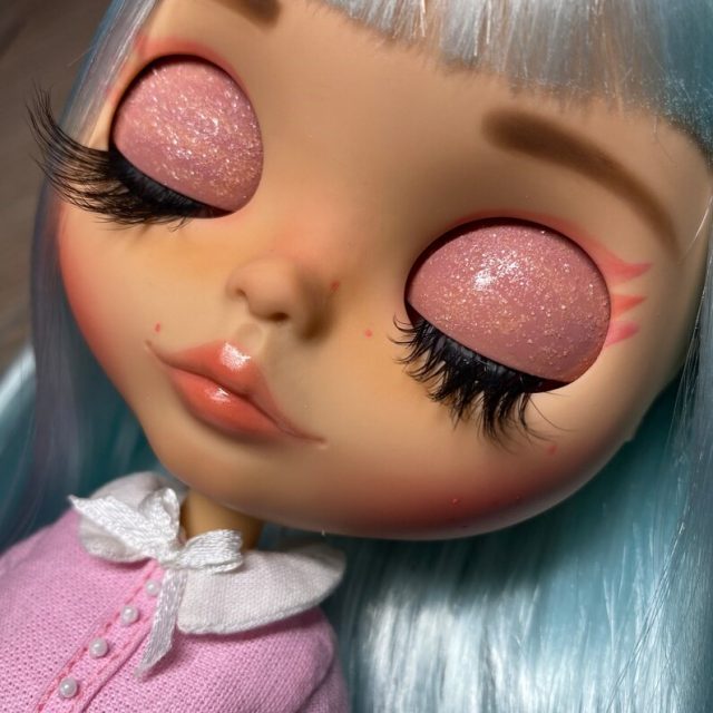Neo Blythe Doll models come with four different eye colors and positions. Blythe has a large head to incorporate the eye-change mechanism, which is controlled by a pull cord running from the back of the head that all work without the help of batteries. Blythe’s eyes are large and round, and they change from a variety of colors such as green, pink, yellow, blue, brown, and gray each time the string is pulled, momentarily closing between each cord pull. Although each Blythe doll comes with four sets of eyechips already installed, you can always customize Blythe eyechips to your liking from galaxy design to hearts to human-like eyes. In addition to traditional eye dolls, some of the new generation custom Blythe dolls have sleepy eyes integrated, which a second cord allows changing the gaze into the sleepy position.