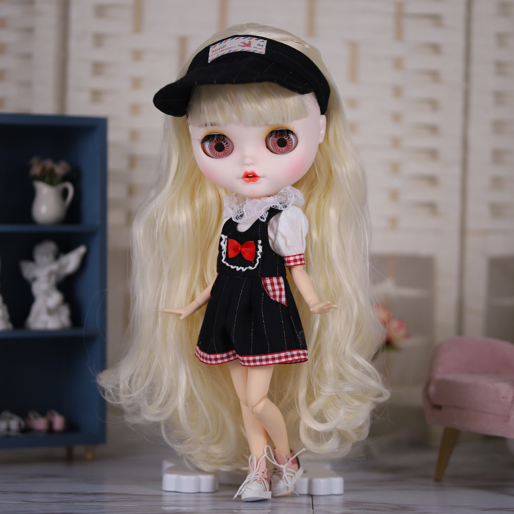 This nice black overall dress with cap, it is perfect for your Neo Blythe doll. It is made of a soft, black and white striped fabric with a red bow on the front. The overalls are made of black and red checkered fabric with a red bow on the front. The cap is made of black fabric. This outfit is sure to make your doll look stylish and fashionable.