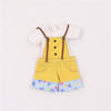 • Overalls available in soft beige, sunny yellow, sky blue, and classic denim, each with unique button and pocket detailing.