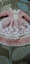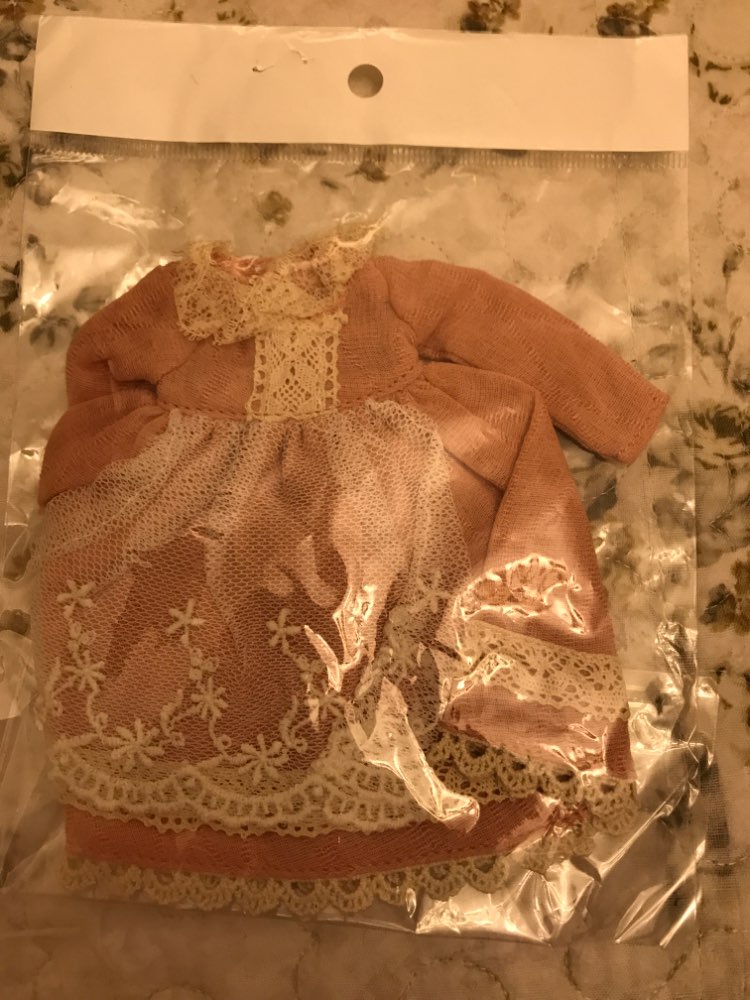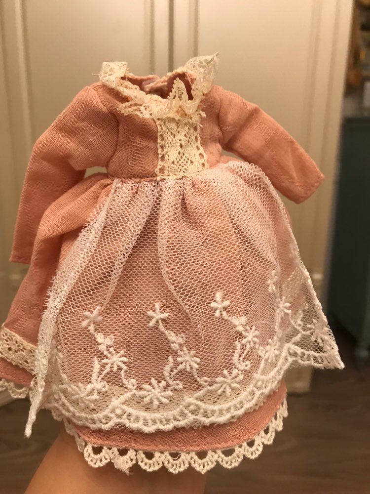Chic dress! Very beautiful. Well sewn. The fabric is soft, thin lace. Great clothes for our first doll.