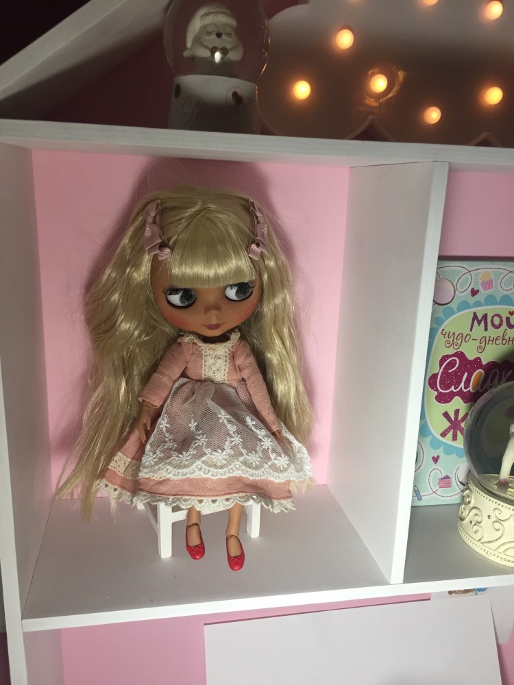 Cute dress with velcro on the back. Made of not very dense fabric, slightly like gauze. Sticks out a thread, and if you wear a dress very actively, it can fall asleep. For this minus. But the doll looks good, a little wide at the waist.