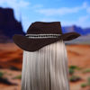 • Statement hat: Wide-brimmed brown hat with decorative chain detail for a bold Western look.