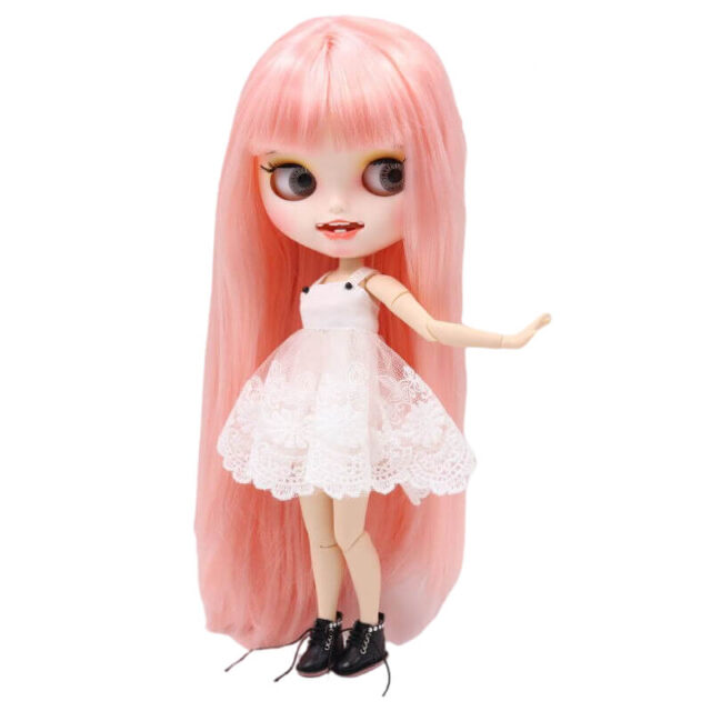 Neo Blythe Doll models come with four different eye colors and positions. Blythe has a large head to incorporate the eye-change mechanism, which is controlled by a pull cord running from the back of the head that all work without the help of batteries. Blythe’s eyes are large and round, and they change from a variety of colors such as green, pink, yellow, blue, brown, and gray each time the string is pulled, momentarily closing between each cord pull. Although each Blythe doll comes with four sets of eyechips already installed, you can always customize Blythe eyechips to your liking from galaxy design to hearts to human-like eyes. In addition to traditional eye dolls, some of the new generation custom Blythe dolls have sleepy eyes integrated, which a second cord allows changing the gaze into the sleepy position.