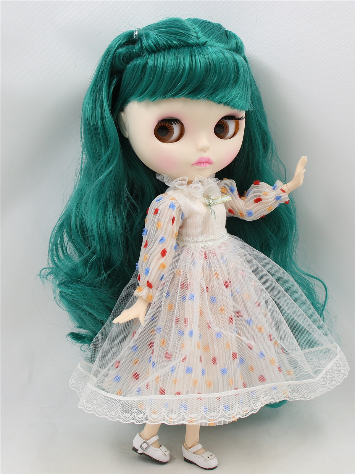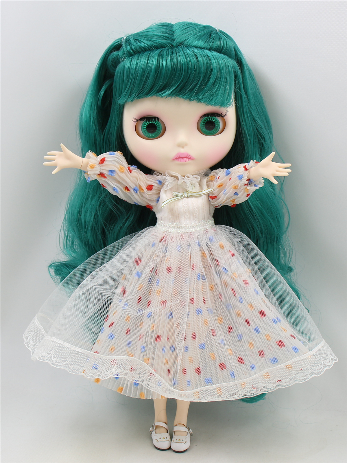 Neo Blythe Doll with Green Hair, White Skin, Matte Pouty Face & Custom Jointed Body