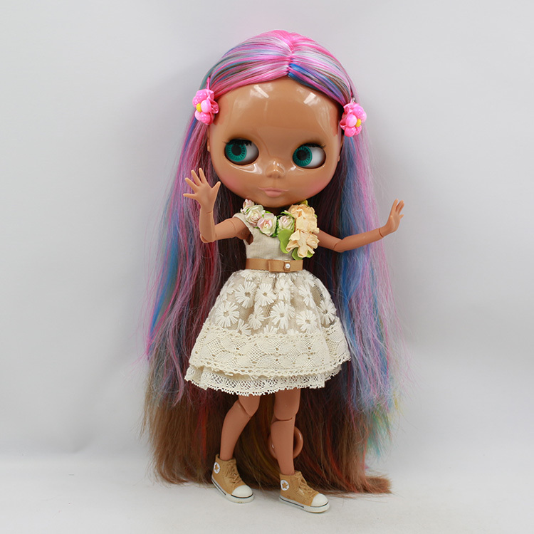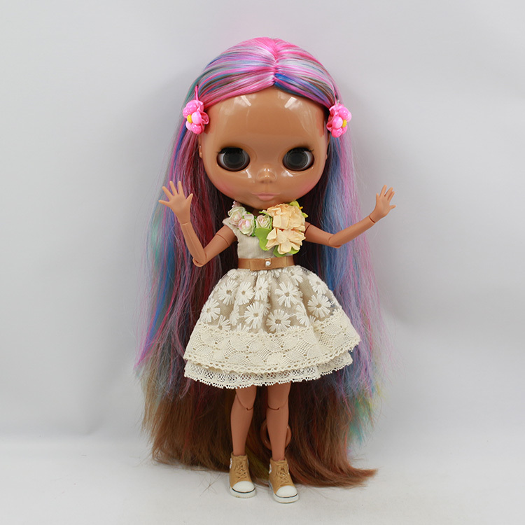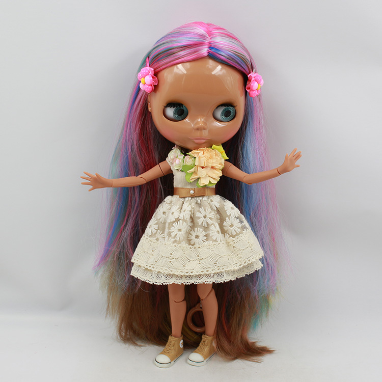Neo Blythe Doll with Multi-Color Hair, Dark Skin, Shiny Face & Jointed Body Dark Skin Factory Blythe Doll Multi-Color Hair Factory Blythe Doll Shiny Face Factory Blythe Doll