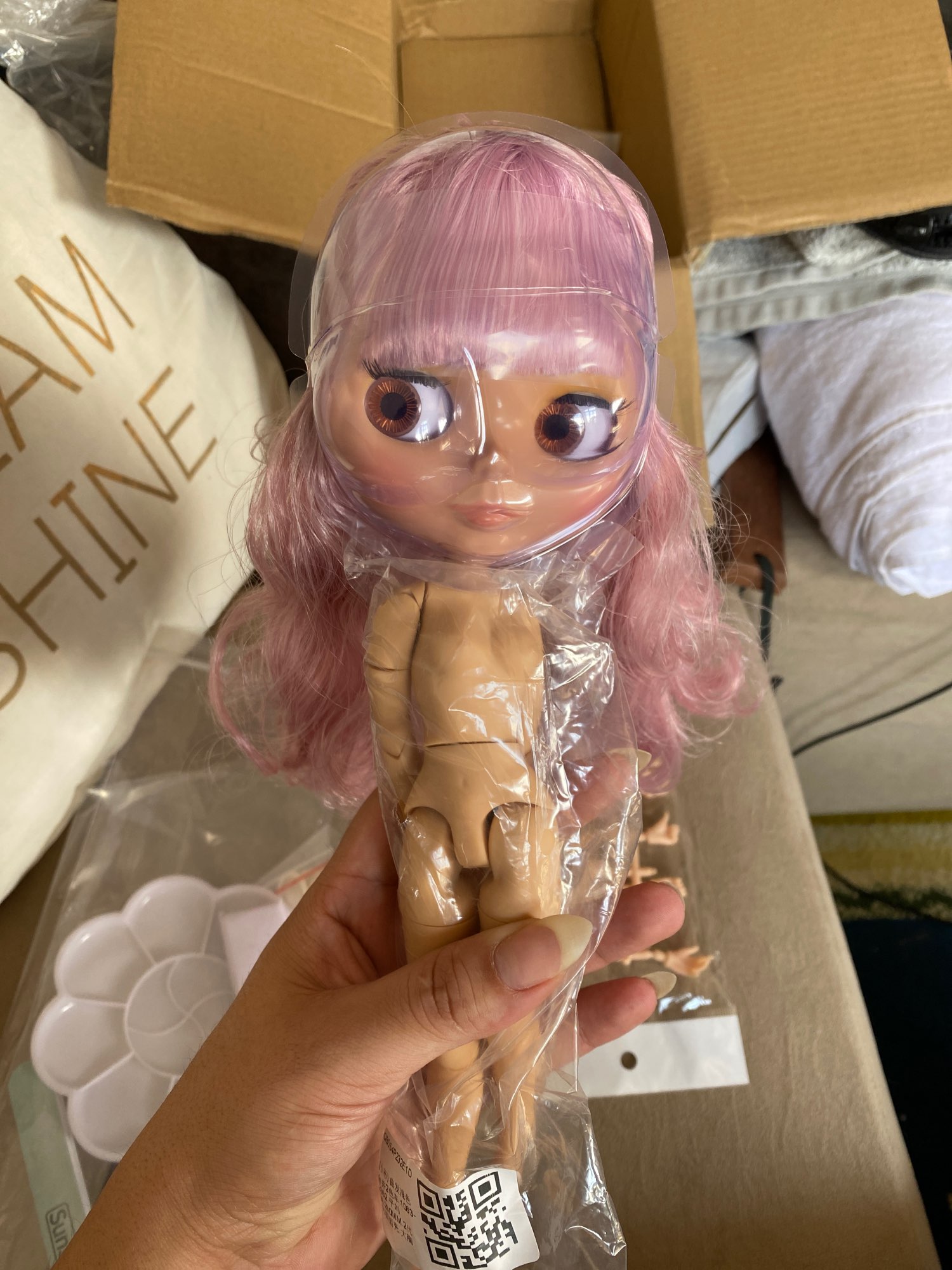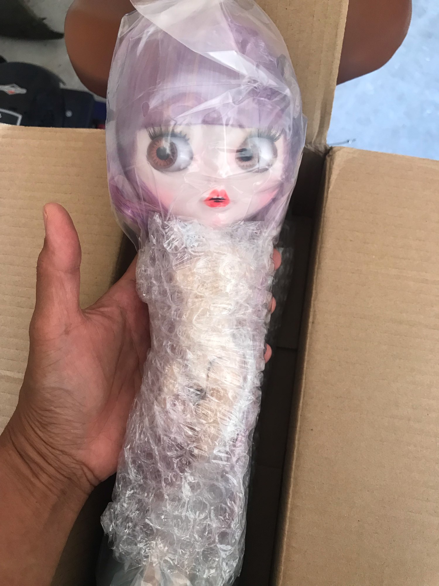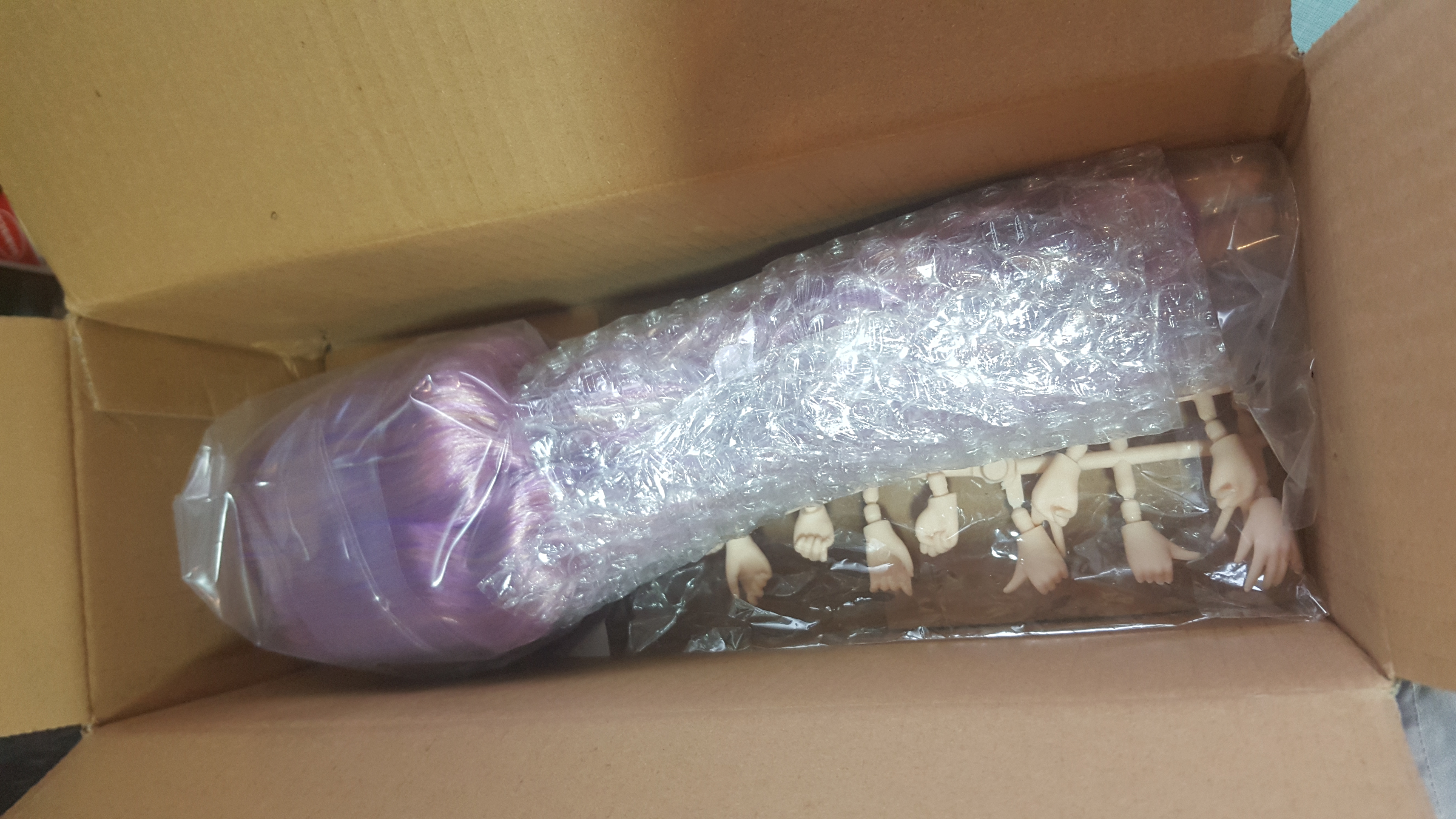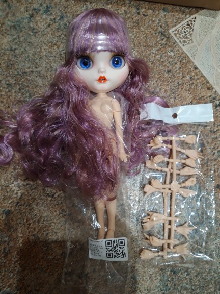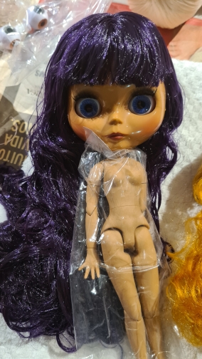 A pretty Blythe doll with tan skin, glossy face and great purple-colored hair. I love the doll so much! The body is heavy and soft to touch, very pretty. The hair feels heavy.TIB gave me 10 pairs of free hands. The box was perfectly packed and delivered just in two weeks, which is quite fast.