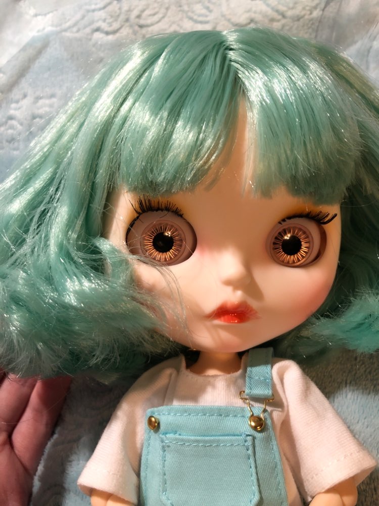 I’m pleased with the whole experience from the website navigation to the delivery process. The doll arrived intact in a sturdy box. I also got a free coaster with a logo from This Is Blythe. The hair is just gorgeous. My doll has a matte face and a strong body. The clothes and shoes are very beautiful. The eye mechanism works perfectly. Thanks for the gift.