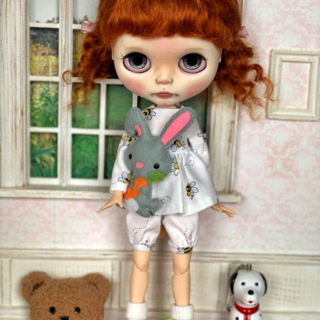 – She will travel with the complete outfit as shown in the pictures. The little bunny is not included.
