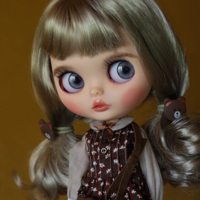 Neo Blythe Doll models come with four different eye colors and positions. Blythe has a large head to incorporate the eye-change mechanism, which is controlled by a pull cord running from the back of the head that all work without the help of batteries. Blythe’s eyes are large and round, and they change from a variety of colors such as green, pink, yellow, blue, brown, and gray each time the string is pulled, momentarily closing between each cord pull. Although each Blythe doll comes with four sets of eyechips already installed, you can always customize Blythe eyechips to your liking from galaxy design to hearts to human-like eyes. In addition to traditional eye dolls, some of the new generation custom Blythe dolls have sleepy eyes integrated, which a second cord allows changing the gaze into the sleepy position.